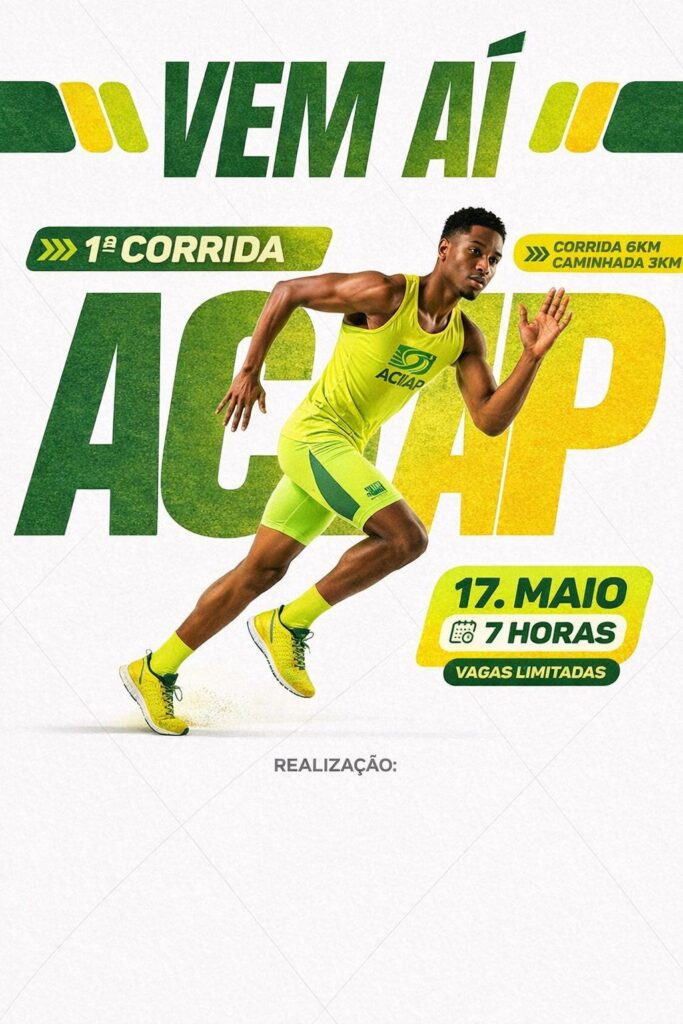 A ACIAP (Associação Comercial, Industrial e Agropecuária de Porangatu) convida toda a comunidade para participar da 1ª Corrida da ACIAP, um evento esportivo que incentiva saúde, bem-estar, integração e o fortalecimento da comunidade empresarial e esportiva de Porangatu.